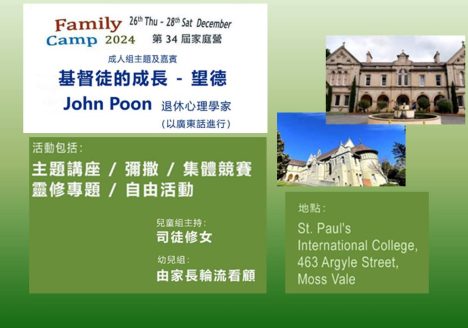 2024年 CCC 家庭營的介紹短片 日期︰ 26 Thu ~ 28 Sat / 12 / 2024地點︰ St. Paul’s International College, 463 Argyle Street, Moss Vale, NSW 2577 成人組主題︰基督徒的成長— 望德 活動︰主題講座, 彌撒, 集體競賽, 靈修專題, 自由活動 (A) Adult Cantonese Group成人粤語組 主講嘉賓 Dr. John Poon (退休心理學家 , 以廣東話進行) (B) Children Group兒童組 (Kindergarten – Year 6) 司徒修女主持(C) Toddlers Group幼兒組 (Age of…