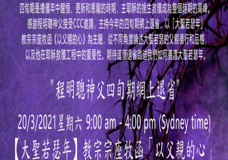 20/3/2021 主題【大聖若瑟年】教宗宗座牧函「以父親的心」 Fr. Ching Online Retreat退省錄影 為了讓避靜者更能獲益,程神父希望各人在參加這次避靜之前,先有基礎: 一、閱讀宗座牧函《以父親的心》; 二、觀看程神父9集解讀此牧函的視頻。而避靜中,神父將會從其他角度進一步帶領參與者反思如何在生命中,活出大聖若瑟與牧函的精神和行動。 第1/9講:前言:以父親的心https://youtu.be/BEHtzQoceUE 第2/9講:受愛戴的父親https://youtu.be/vprXFMWiU8c 第3/9講:溫良慈愛的父親https://youtu.be/nU2b6YxOwOM 第4/9講:服從的父親https://youtu.be/Jpti3784EHU 第5/9講:接納的父親https://youtu.be/dgef6gHLkRM 第6/9講:富有創意勇氣的父親https://youtu.be/UvI_4vvnmVk 第7/9講:勞動的父親https://youtu.be/S1kfYMfTa-c 第8/9講:反映天父影像的父親https://youtu.be/khNypU41-84 第9/9講:結語:上主給若瑟說https://youtu.be/QFXO1UEurV8 為支持程神父的福傳工作,請捐款與十字架同行者修會(Companions of the Cross)捐獻連結: https://companionsofthecross.givecloud.co/Fr-Francis-Ching (可選擇以加幣或美金作捐獻。) 也請支持華人天主教會經費。 BSB: 012-432 Account No. 250193503 Reference/Description:Donation 注意事項:為確定你們收到我們的電郵回覆, 而不會送到你的 junk, spam 或 promotion folder中,請在你的手機、平版電腦或電腦中加入我們的電郵地址。