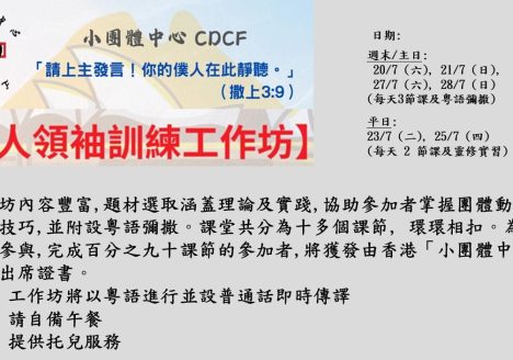 工作坊內容豐富,題材選取涵蓋理論及實踐,協助參加者掌握團體動力的知識及技巧。並附設粵語彌撒及明供聖體。課程共分為十多個課節,還還相扣。 為鼓勵全面參與完成百分之九十課節的參加者,將獲由小團體中心頒授的出席證書。工作坊將以粵語進行,並輔以普通話即時傳譯。 請自備午餐或預訂飯盒。提供托兒服務。 報名請在此連結