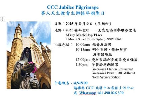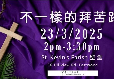 Date: 23/3/2025Time: 2pm – 3:30pmLocation: St. Kevin’s ChurchAddress: 36 Hillview Rd, Eastwood 不一樣的拜苦路:3月23日(第四主日)下午2時至3時30分,將於St Kevin’s聖堂內舉行「不一樣的拜苦路」。希望教友在各自不同的人生路上,能夠一起匯聚在主耶穌的苦路上,共同靈修和分享。歡迎所有教友,特別是無法在星期五晚上參與拜苦路的教友參與。