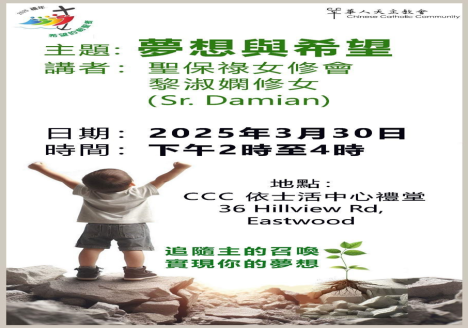 教宗方濟話:「如你沒有夢想,你便有惡夢!」CCC 承邀聖保祿女修會的黎淑嫺修女,於3月30日(星期日),下午2時半至4時半,在依士活中心禮堂,舉行名為 「夢想與希望 」的講座。 歡迎願意努力跟隨上主的召喚、去實現夢想的兄弟姊妹踴躍參加! Date: 2025年 3月 30日, 星期日 (30 March 2025, Sunday)Time: 下午2時半至4時半 (2:30pm – 4:30pm)Address: CCC 依士活中心禮堂36 Hillview Rd, Eastwood