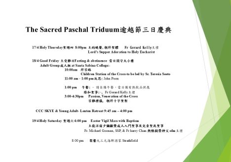 17/4 Holy Thursday聖週四 8:00pm 主的晚餐, 朝拜聖體 Fr Gerard Kelly主禮 Lord’s Supper Adoration to Holy Eucharist 18/4 Good Friday 主受難日Fasting & abstinence 當日須守大小齋 Adult Group成人組 at Santa Sabina College:- 10:00am 拜苦路 Children Station of the Cross-to be led by Sr. Teresia Seeto 11:00 am – 1:00 pm 反思: John Poon主講 主题-[ 禧年:在苦難中的朝聖] 1:00 pm 午餐: – 請自備午餐,當日備有熱飲品供應 修和聖事:– Fr Gerard Kelly主禮 3:00-4:30pm Passion, Veneration of the Cross 苦難禮儀, 朝拜十字聖架 CCC…