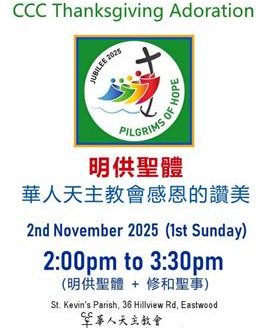 CCC為感謝上主,在過去一年,陪伴和保守我們,在St Kevin’s 聖堂舉行明供聖體-華人天主教會感恩的讚美。屆時由Fr Gerard Kelly帶領北區中心、依士活中心各委員和善會小組成員聯同高齡之家,將代表本會向上主獻上感恩的祈禱,最後以聖體降福結束, 歡迎所有教友參與,同頌主恩。 Fr Gerard, our Spiritual Director will be the celebrant. Committees and Groups of the Lindfield Centre andEastwood Centre, together with the CCC Homes will come together to worship & praise our Lord, thenconcluded with Benediction. All are welcome to join.