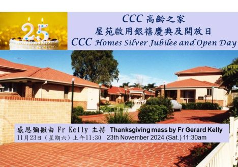 感恩彌撒由 Fr Kelly 主持 地址 : 高齡之家 *可以安排當日上午十一時在 Toongabbie 火車站接載 (WhatsApp ☏ 0490 026 379) 時間 : 11月23日 (星期六) 上午11:30彌撒後12:30pm有午餐(午餐歡迎自由捐獻給關神父用以幫助加沙的孩子) 開放日至2:30pm 結束 十一月十七日或之前請到北區中心/依士活中心登記 Thanksgiving mass by Fr Gerard Kelly Address: 6 Portia Rd Toongabbie * can arrange pick-up at Toongabbie train station at 11am via WhatsApp ☏ 0490 026 379 Time: 23th November 2024 (Sat.) 11:30amLunch after…