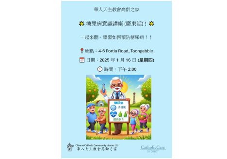 華人天主教會高齡之家 糖尿病意識座 日期︰ 2025 年 1 月 16 日 (星期四) 時間︰下午 2:00 地點︰ 4 – 6 Portia Road, Toongabbie 講座以廣東話進行。一起來聽,學習如何預防糖尿病!