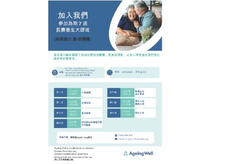 CCC 高齡之家聯同 CatholicCare 合辦一個名為「長壽養生大師班 Ageing Well Masterclasses」的課程,主題涵蓋社會聯繫、飲食、運動及精神健康等。課程為期七個星期,逢星期二上午十點到中午十二點,於 Flemington St Dominic’s Church 講室上課。英語主講,國粵語翻譯,備有茶點,首課主題為[ 社會聯繫 ],歡迎大家參加。有興趣者可在依士活中心接待處登記。 St Dominic’s Church 上午九點有平日彌撒,聖堂設有停車場。 日期︰11/02/2025 – 25/03/2025 (逢星期二,共 7 週) 時間︰10:00 am – 12:00pm 地點︰Flemington St Dominic’s Church 講室 (Flemington 火車站對面) 語言︰英語主講,國粵語翻譯。 聯絡人︰David Tong